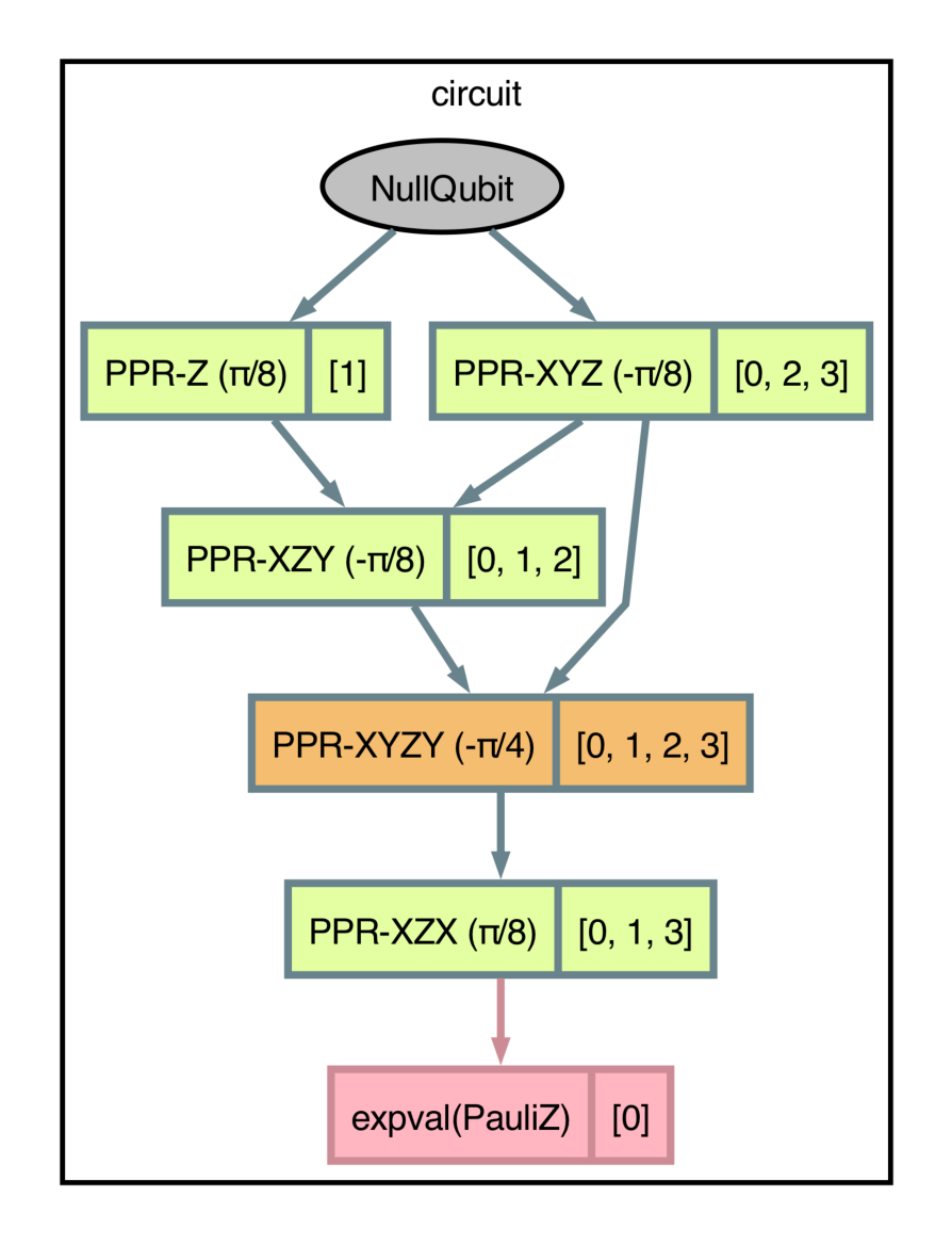import pennylane as qml import jax.numpy as jnp qml.capture.enable() @qml.qjit(target="mlir") @qml.transforms.reduce_t_depth @qml.transforms.to_ppr @qml.qnode(qml.device("null.qubit", wires=4)) def circuit(): qml.PauliRot(jnp.pi / 4, pauli_word="Z", wires=1) qml.PauliRot(-jnp.pi / 4, pauli_word="XYZ", wires=[0, 2, 3]) qml.PauliRot(-jnp.pi / 2, pauli_word="XYZY", wires=[0, 1, 2, 3]) qml.PauliRot(jnp.pi / 4, pauli_word="XZX", wires=[0, 1, 3]) qml.PauliRot(-jnp.pi / 4, pauli_word="XZY", wires=[0, 1, 2]) return qml.expval(qml.Z(0))